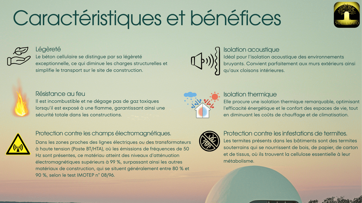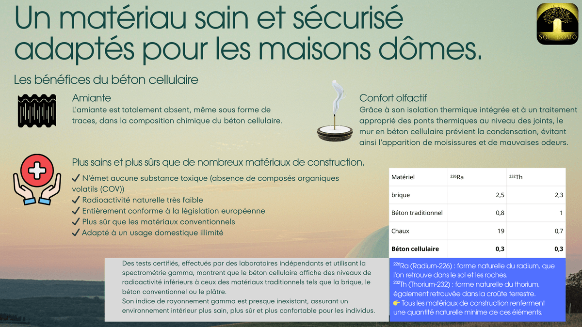 Pour ces raisons, le béton cellulaire est largement utilisé dans la construction durable, l’architecture bioclimatique et les systèmes constructifs innovants tels que les dômes monolithiques.
