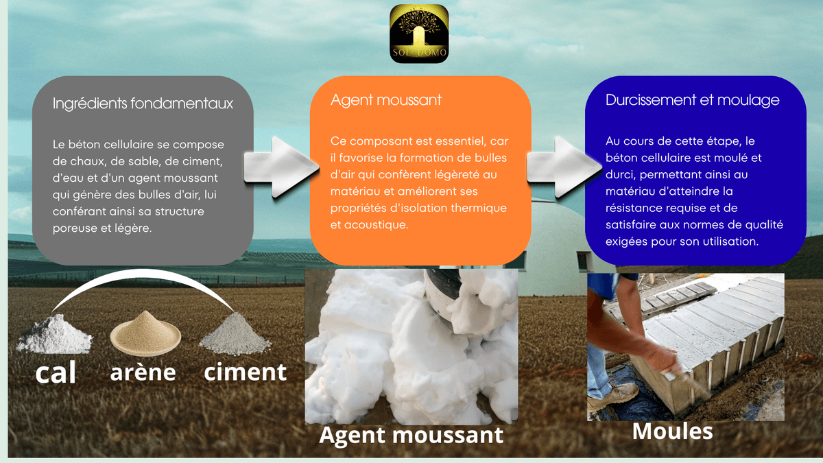 Le béton cellulaire est un matériau composé de ciment, de chaux, de sable, d’eau et d’air.